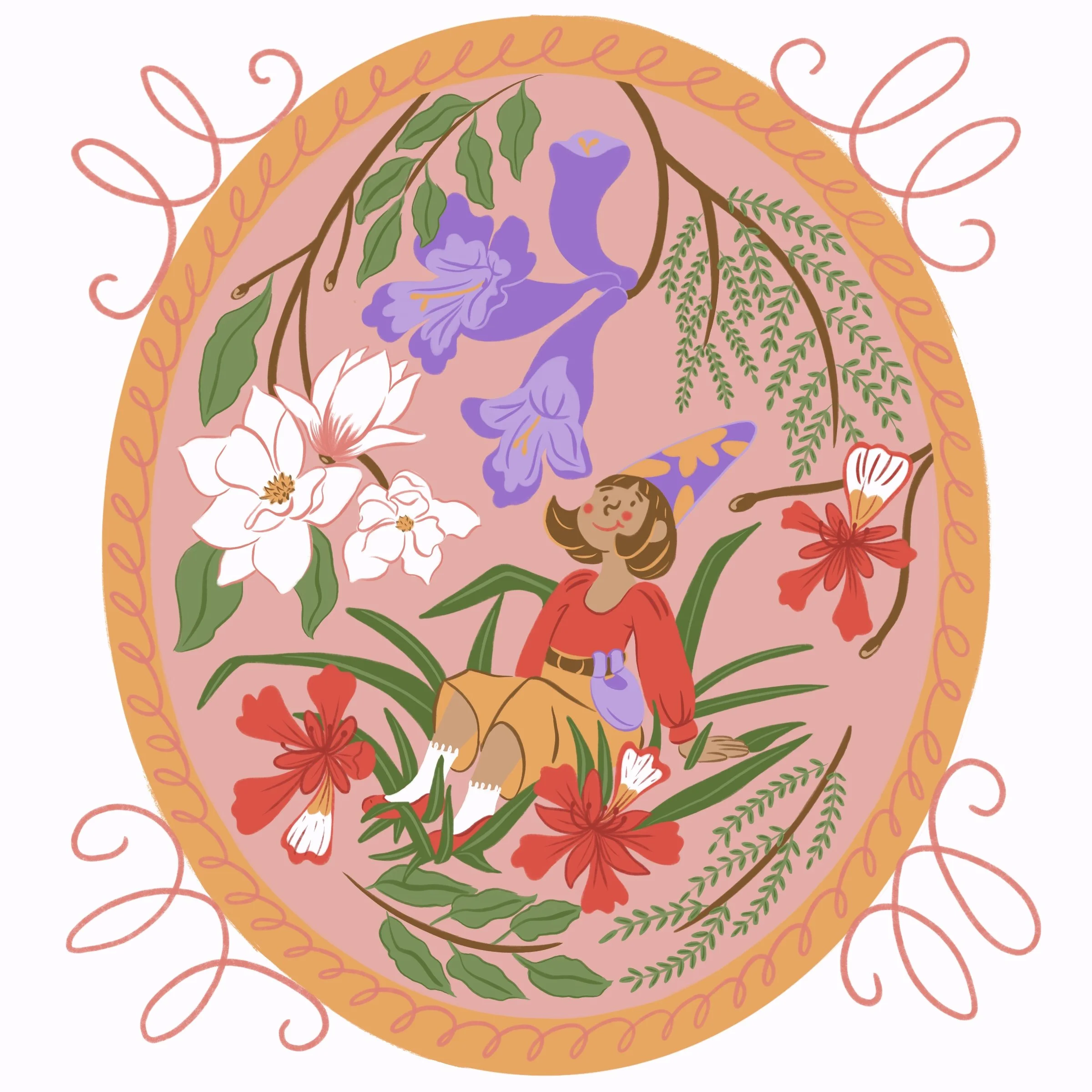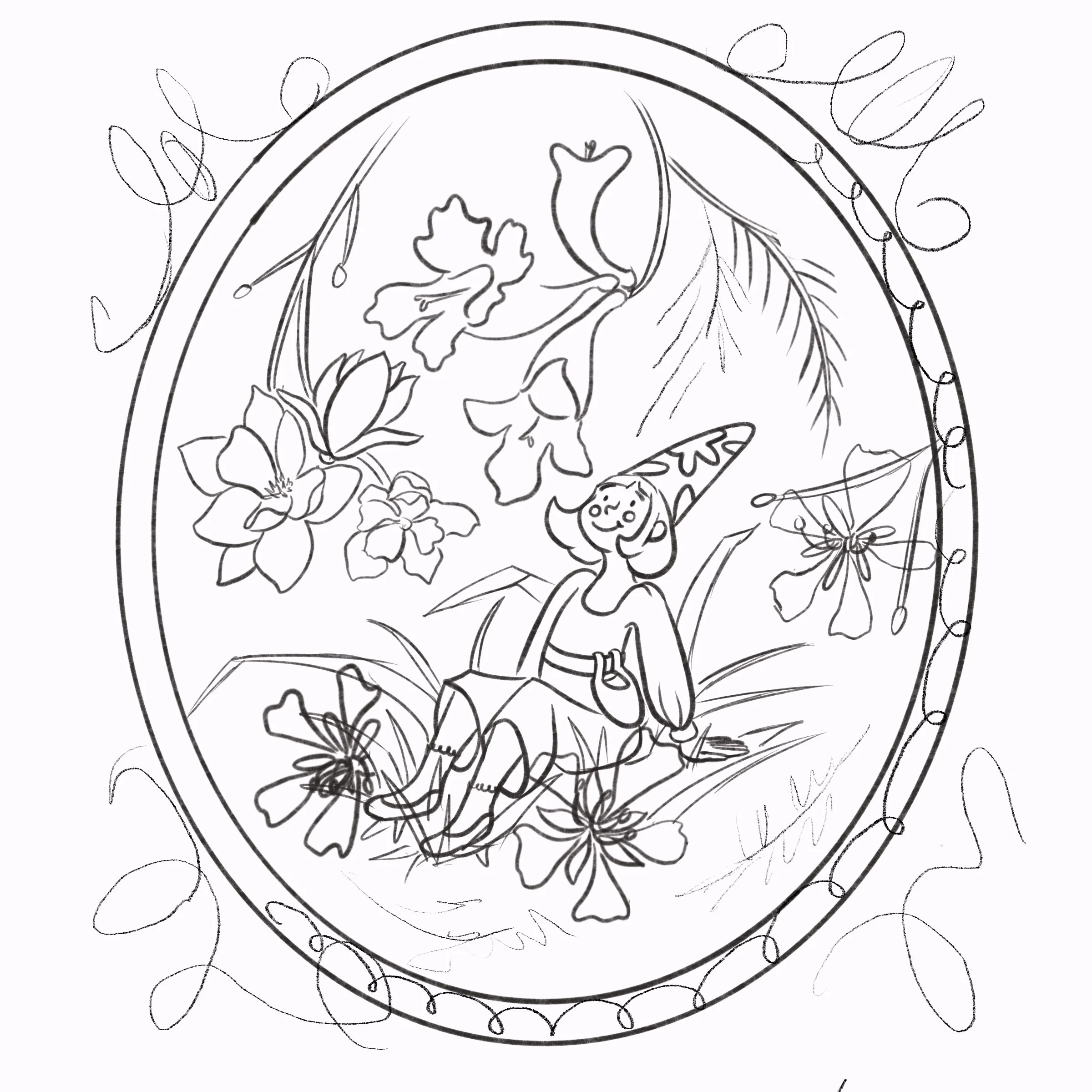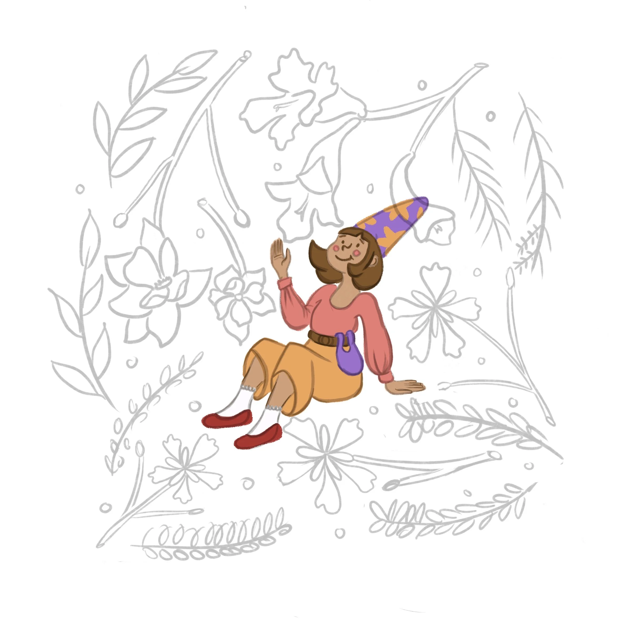 Many sketches were made and discarded until I finally considered adding a frame. I wanted to feel like the character is enveloped in this cozy abode filled with the flowers circling and opening, showing their colors.