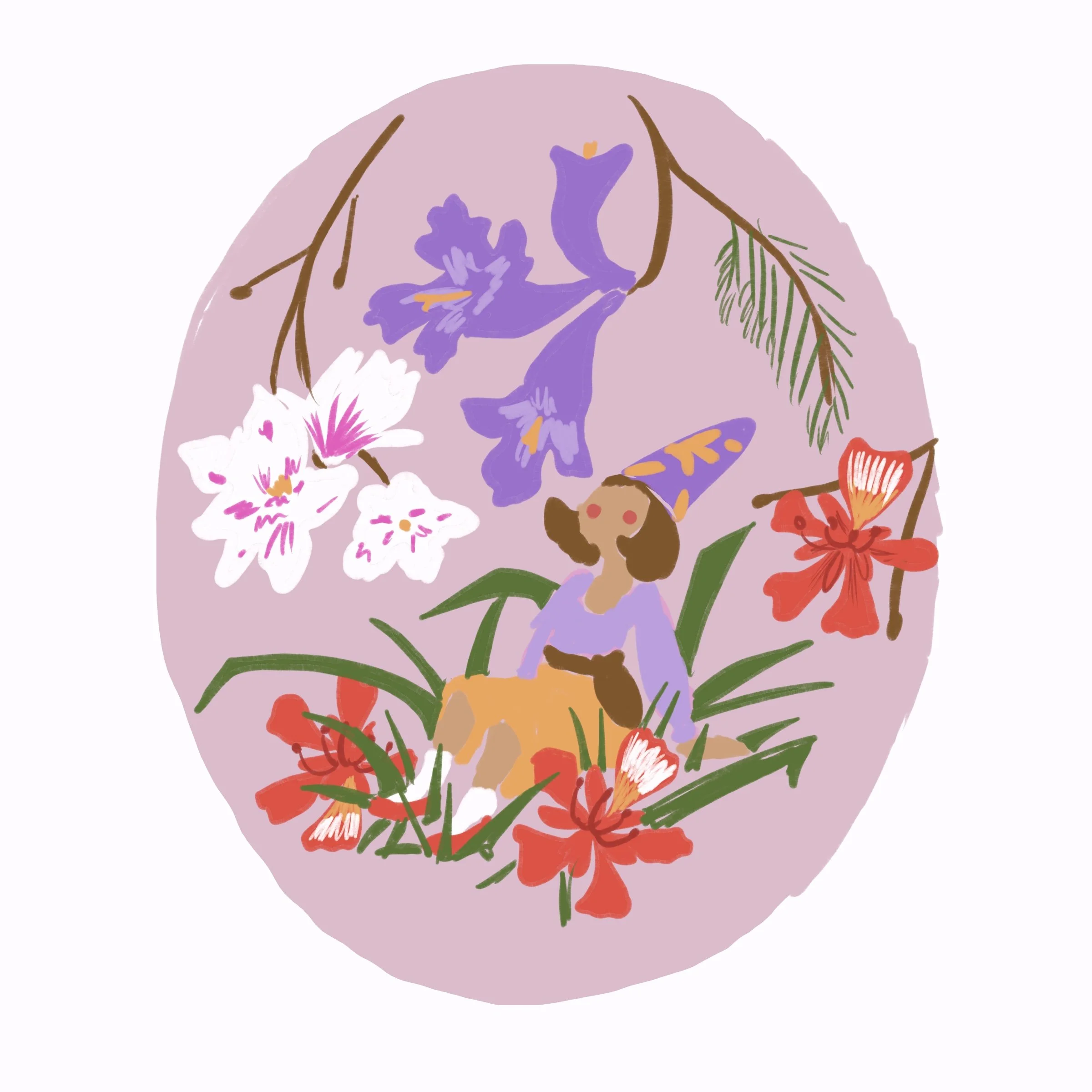 I created this piece to showcase my love for the three flowering trees you can see in spring in my origin city in central Mexico. To do this, I sketched the blossoms many times, researched the leaves that accompany the flowers, and decided to include one of the characters I have been sketching out recently, to add interaction, although it ended up being just a gnome enjoying the shade and smell of these flowers. I am so envious!